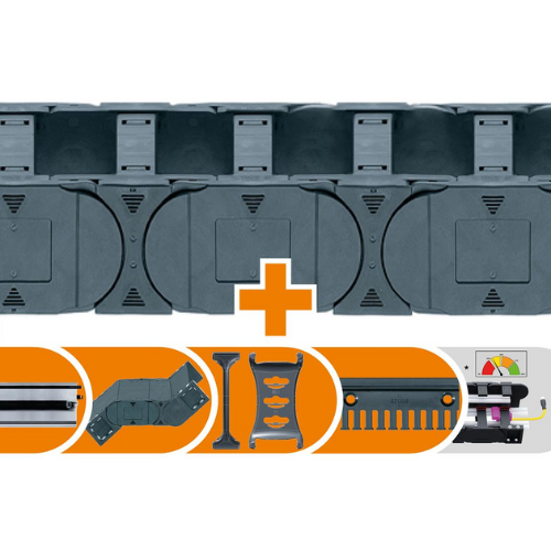 Dodávame aj kompletné sady energetických reťazí vrátane montážnych konzol, vodiacich žľabov, oddeľovačov, odľahčovačov ťahu atď. Všetko pre vašu špecifickú aplikáciu.