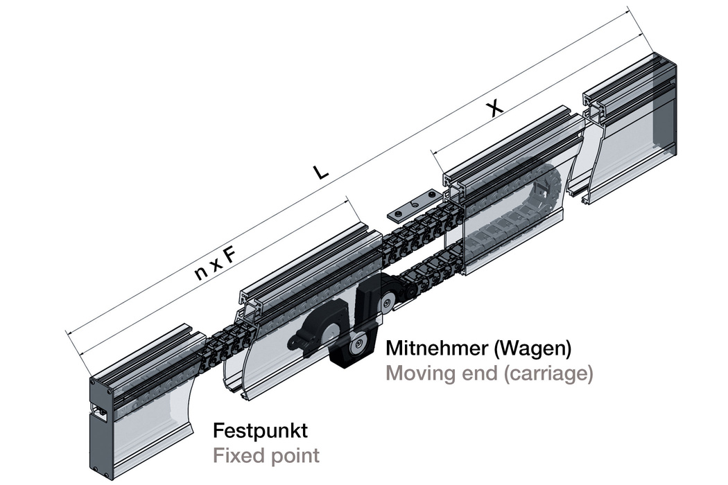 Kompletná sada zahŕňa: sériu energetických reťazí E4.28, koncovky, odľahčenie ťahu, separátory, uzavretý vodiaci žľab z nehrdzavejúcej ocele, pohyblivý a pevný koniec (FTA), montážne sady, nastaviteľné rameno pohyblivého konca.