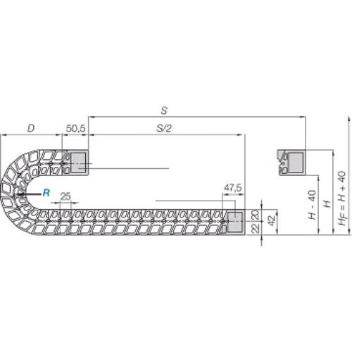 | A = pohyblivý konec B = pevný konec Rozteč: 25 mm na článek Počet článků na m: 40 Pojezd: S Délka řetězu = S/2 +K |