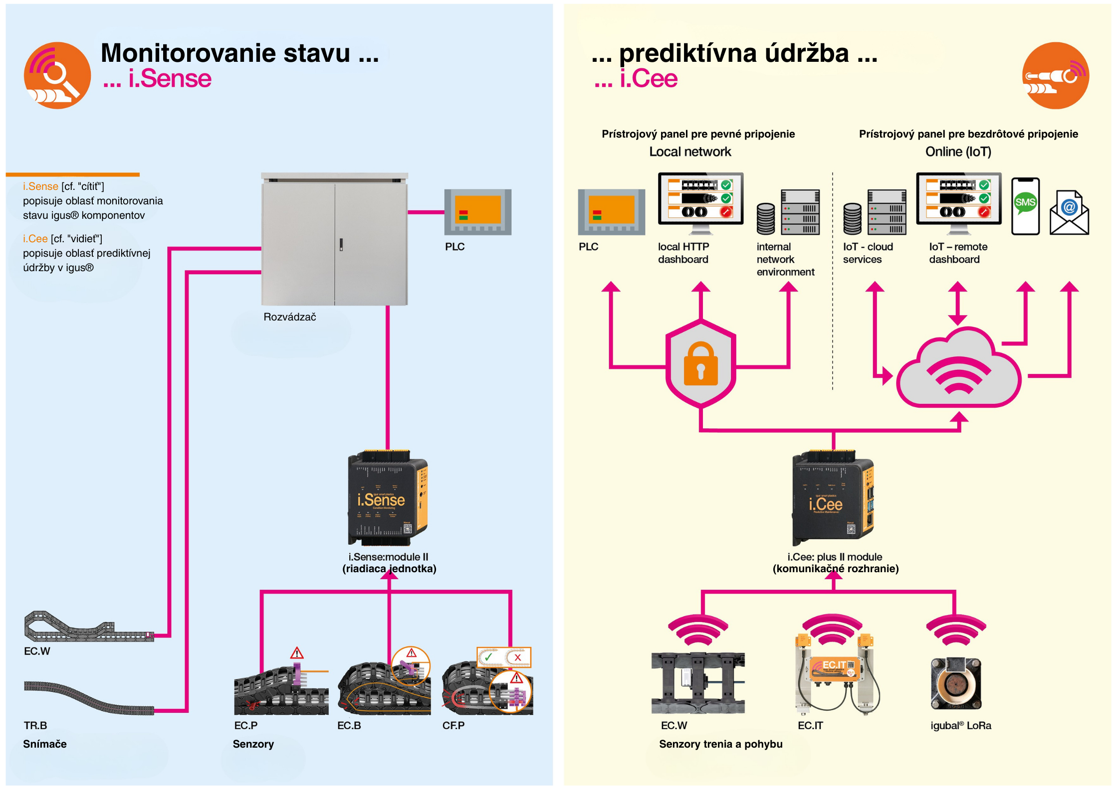 Po prenose nameraných hodnôt zo senzora do modulu icom je potrebné tieto údaje „interpretovať“, aby bolo možné generovať konkrétne pokyny, čo a akým spôsobom je potrebné vykonať. To je možné vďaka pripojeniu ku cloudu spoločnosti igus®. Vzhľadom na rastúci význam IT bezpečnosti sa však firmy čoraz viac spoliehajú na vlastné SCADA systémy. Práve preto spoločnosť igus® vyvinula modul icom.plus, ktorý umožňuje zákazníkom integrovať dáta spôsobom vhodným pre ich zariadenia a interné systémy.