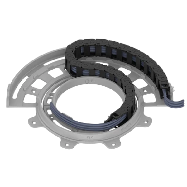 - Rotačné pohyby sa vyznačujú nižšou inštalačnou výškou. Reťaze e-chain® sa prevažne kĺžu po povrchu z polyméru, nehrdzavejúcej ocele alebo ocele a sú vedené v žľabe určenom pre rotačné aplikácie. Dostupné polomery ohybu a výšky reťaze závisia od zvoleného typu energetickej reťaze e-chain®.